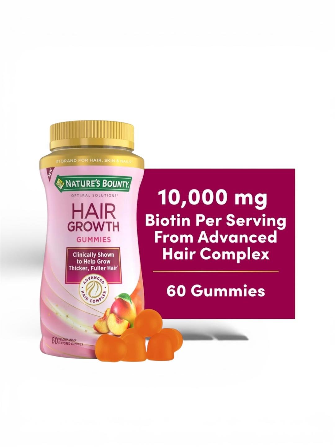 Nature’s Bounty Optimal Solutions Hair Growth Gummies with Advanced Hair Complex is clinically shown to help grow thicker, fuller hair in just three months.* Our hair follicles can change as we age, making hair appear less thick and healthy. From the #1 Brand for Hair, Skin and Nails vitamins♢, this innovative formulation contains key hair nutrients Biotin, Silicon and Arginine to nourish the hair follicles and provide structural support for existing hair growth and increased thickness.* Two Peach Mango flavored gummies per day deliver key nutrients to support thicker, fuller hair.* These great-tasting gummies are gluten-free and contain no lactose, soy, sodium, fish, or artificial flavors and sweeteners. Each bottle contains 60 gummies, a one-month supply.
